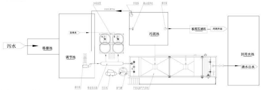 工作原理:在一定條件下,將大量空氣溶于水中,形成溶氣水,作為工作介質(zhì),通過(guò)釋放器驟然減壓快速釋放,產(chǎn)生大量微細(xì)氣泡粘附于經(jīng)過(guò)混凝反應(yīng)后廢水中的“礬花”上使絮體上浮,從而迅速地除去水中的污染物質(zhì)達(dá)到凈水的目的,詳見(jiàn)工藝流程圖。